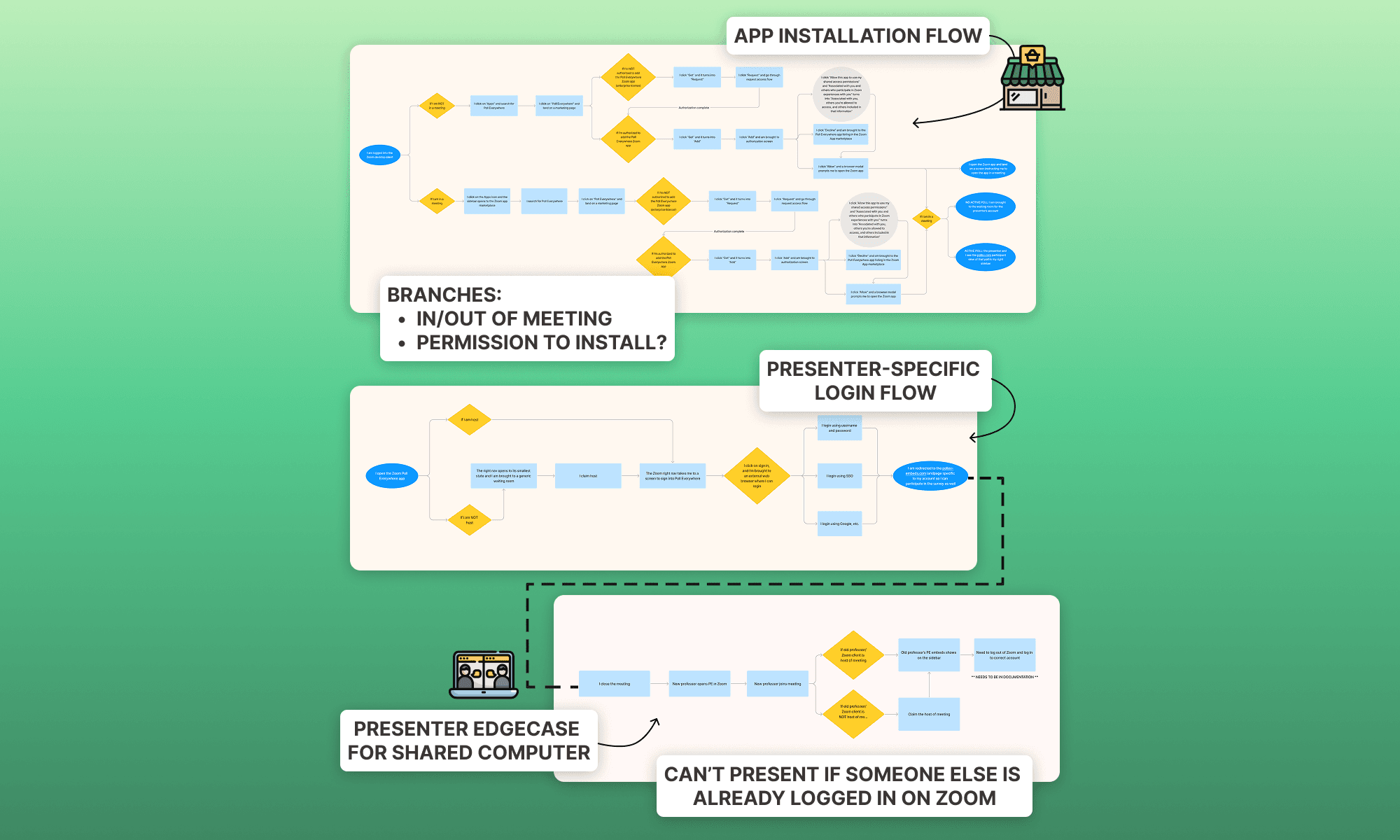 While going through the workflow with an engineer, I discovered a possible edge case for educators or presenters on shared devices — if presenter A was still logged into their Zoom account on a public computer, presenter B would need to log into the correct Zoom account associated with their Poll Everywhere log-in. I flagged this with my PM, corrected the issue with an additional section in the flow chart, and put a note in public documentation.